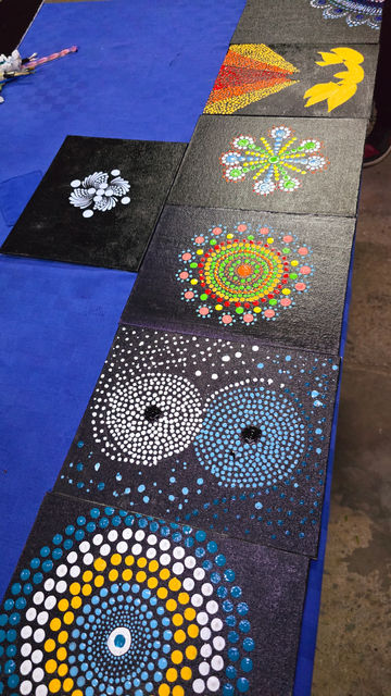 In our sessions, you’ll learn the basics of dot painting techniques while embracing a therapeutic and joyful atmosphere. There’s something truly special about coming together through art, letting go of our daily stresses, and allowing our creativity to flourish.